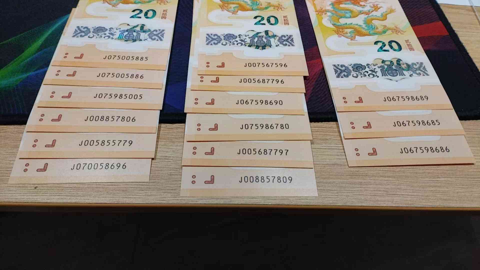 龙钞无34单张满号056789组合,0后无0,数五组合178一张,其他满号160一张,尾8的176一张,不挑号的136一张,要100张