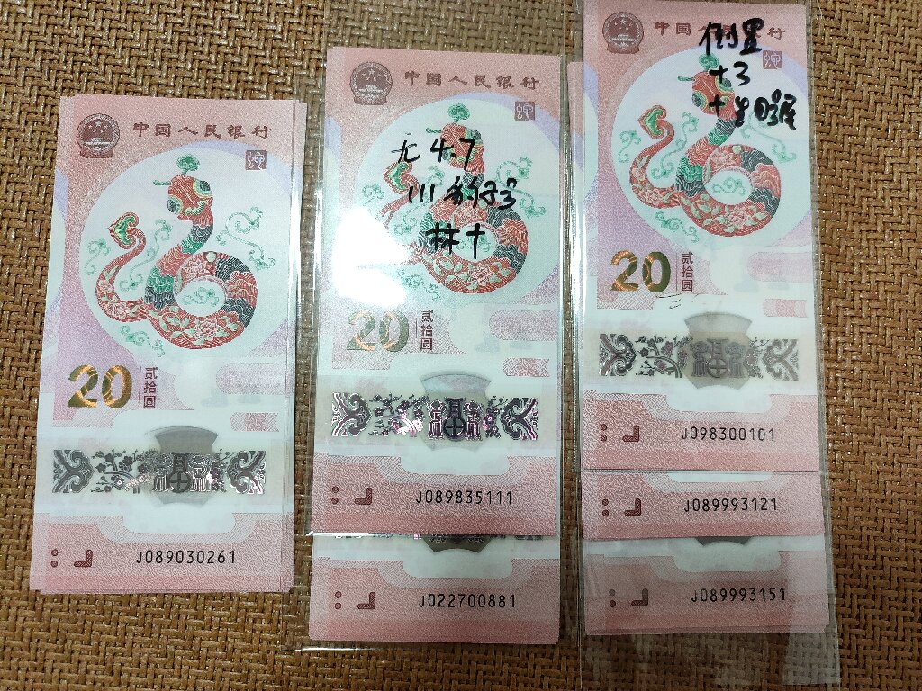 如图,出六组蛇钞标十,无47的5组,豹子标十一组,金山号尾生日号一组,豹子身两组,还有无34尾888靓号一组。61一组只要400,其余5组600一组通走包顺丰。一手货没有评过级。无折无指甲印。