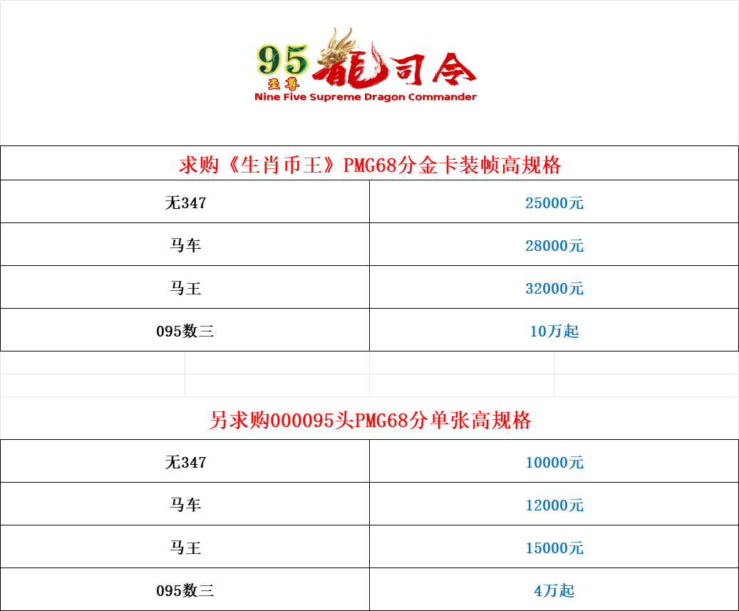 求购:《生肖币王》PMG68分金卡装帧高规格,另求购000095头PMG68分单张高规格,以上各规格各要20张,有货朋友请支持!
