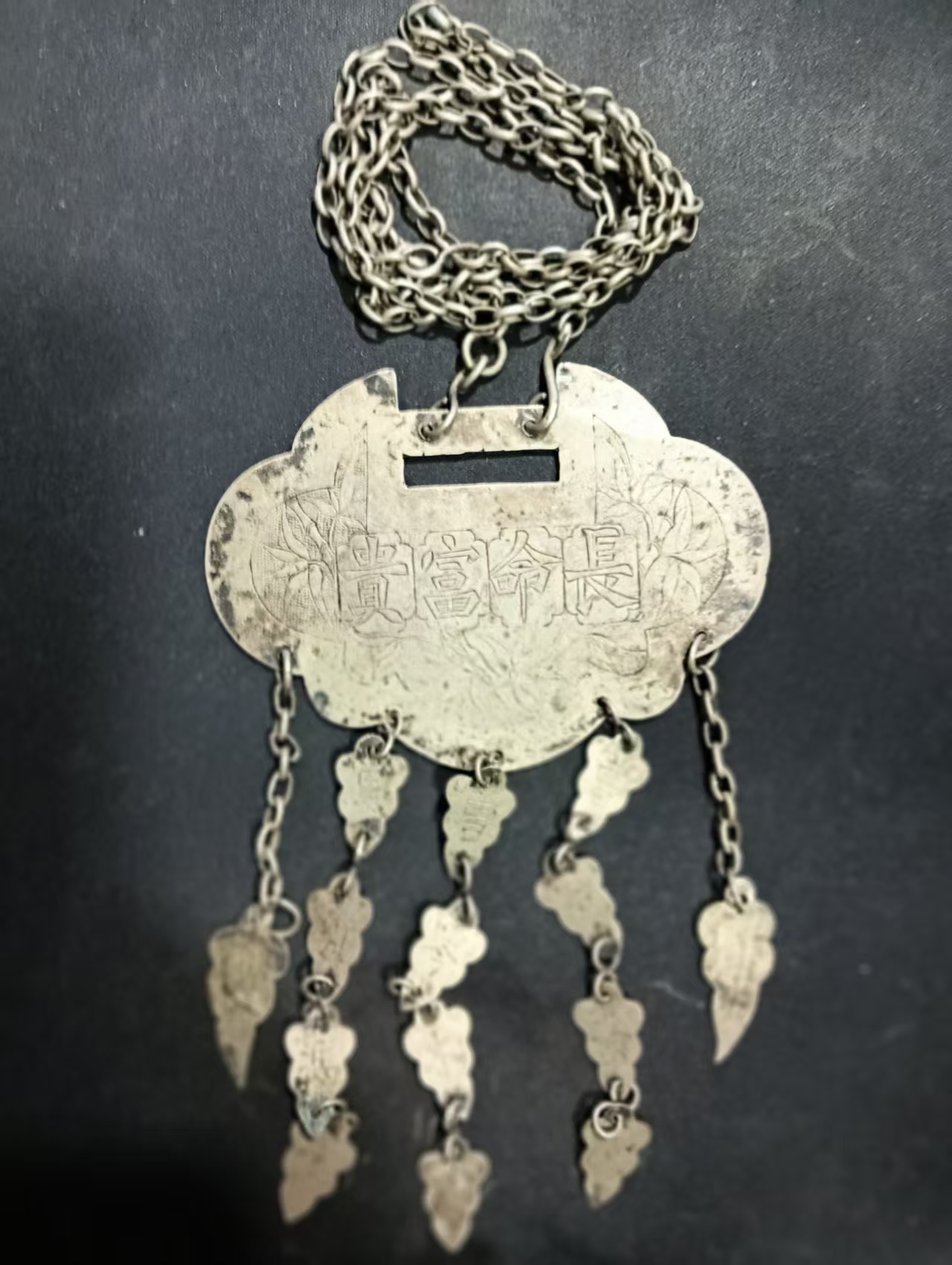正面长命富贵 背面花 百家姓的锁流苏片。。链子 流苏片完整。。图片传不上去。微信看图吧 54克 1600