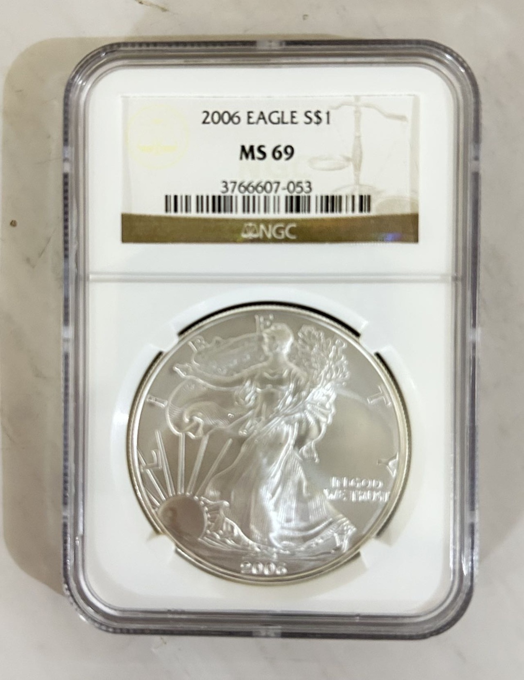 NGC MS69 美国行走女神鹰洋银币1盎司,2006年。包品,包真。价格:430元。