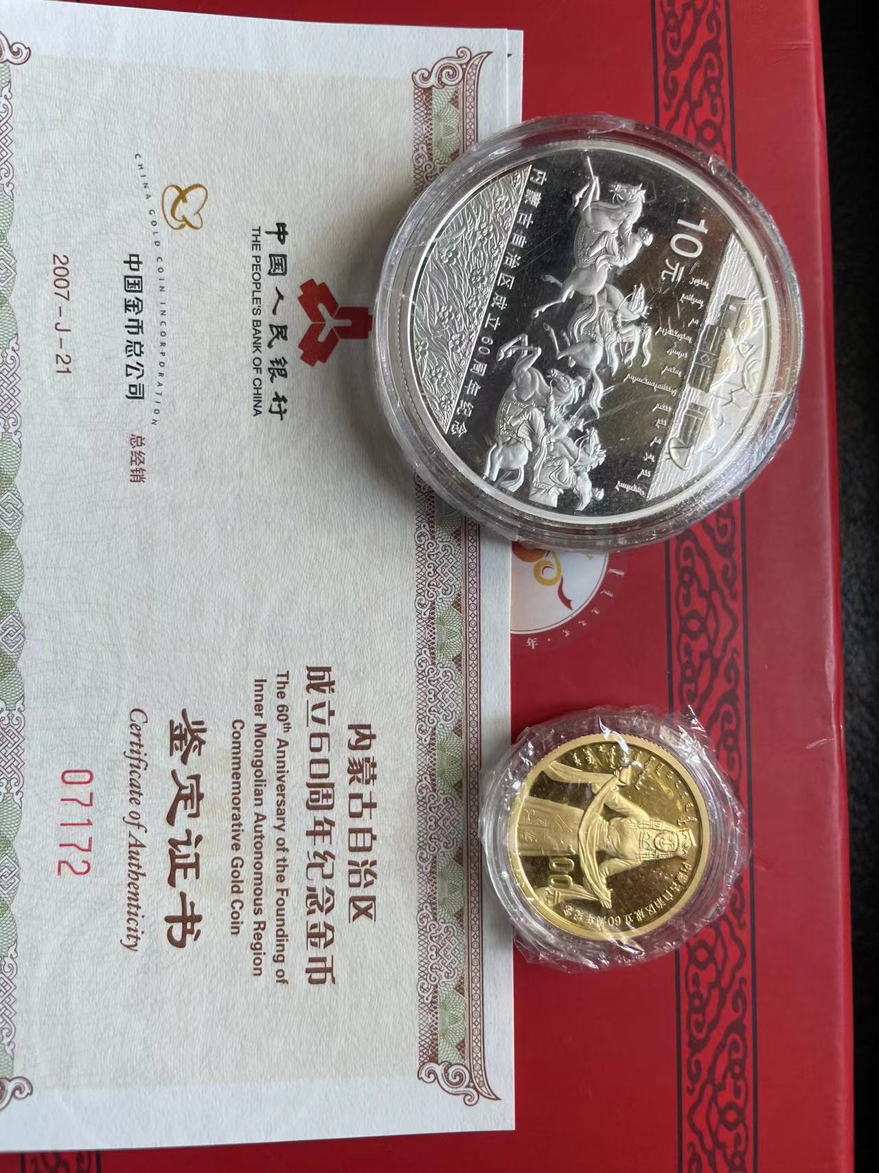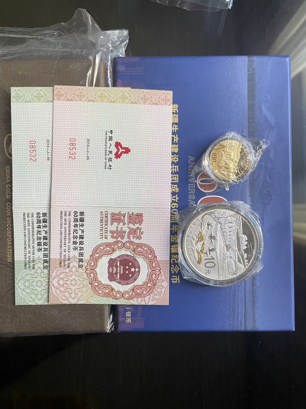 售:华南虎金币1枚7600元,内蒙60周年1套8100元, 西藏解放60年1套8000元,新疆建设兵团1套8000元,