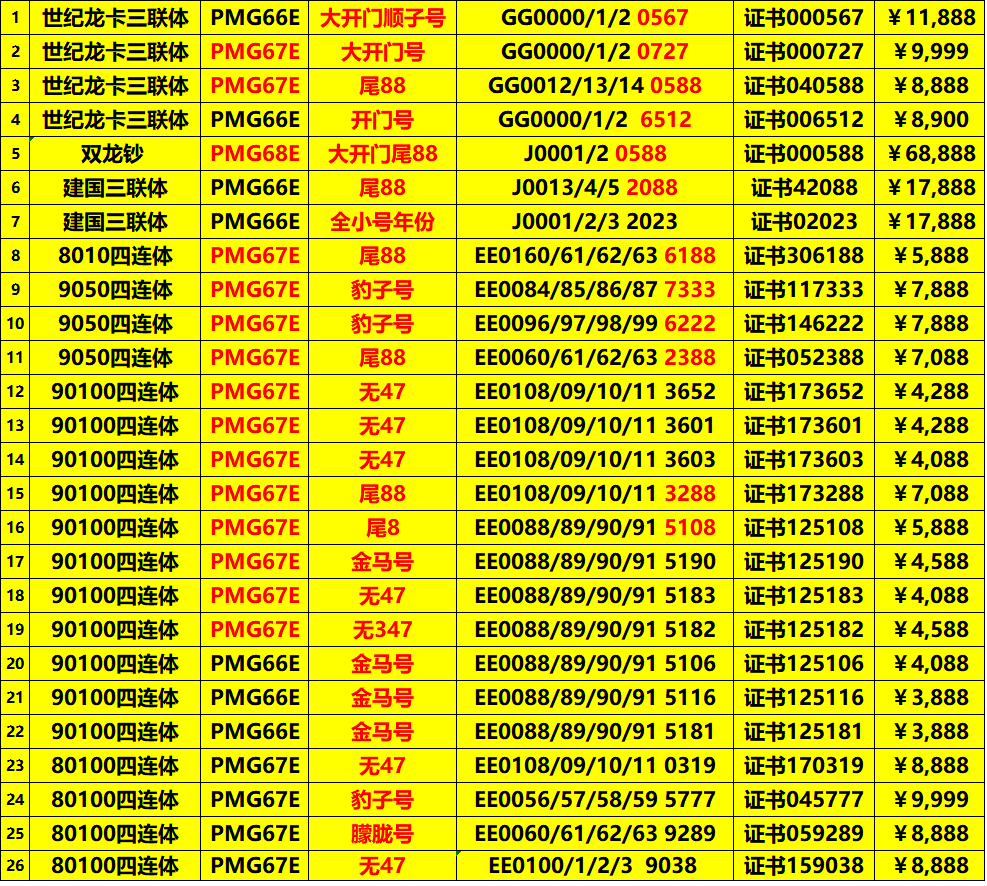 → 双龙钞 世纪龙卡 建国三联体 80100 90100四连体 PMG评级靓号